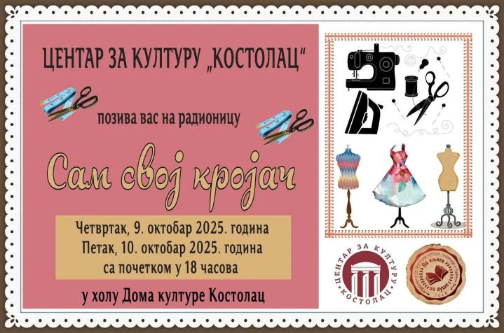 У Дому културе „Костолац“ у четвртак, 9. октобра и у петак, 10. октобра 2025. године, са почетком у 18 часова, одржаће се две кројачке радионице за децу и одрасле „Сам свој кројач – научите да шијете“.
