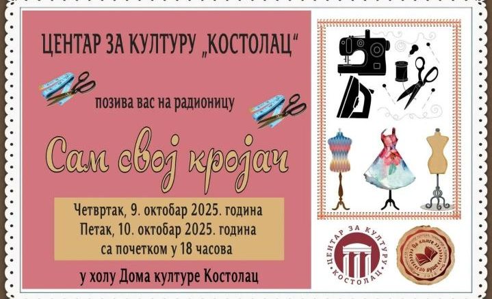У Дому културе „Костолац“ у четвртак, 9. октобра и у петак, 10. октобра 2025. године, са почетком у 18 часова, одржаће се две кројачке радионице за децу и одрасле „Сам свој кројач – научите да шијете“.