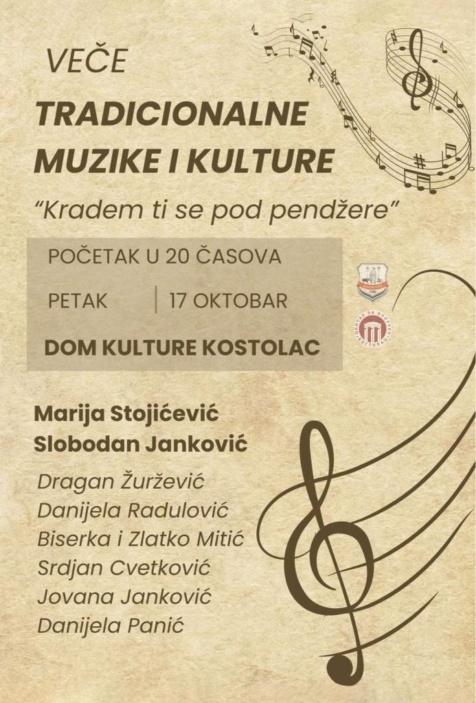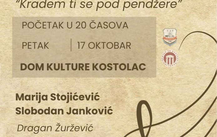 У петак, 17. октобра, са почетком у 20 часова, у Дому културе у Костолцу, Центар за културу „Костолац“ уз подршку Градске општине Костолац, организује незаборавно вече севдаха, изворне песме и топлине старих обичаја, под називом: „КРАДЕМ ТИ СЕ ПОД ПЕНЏЕРЕ“.