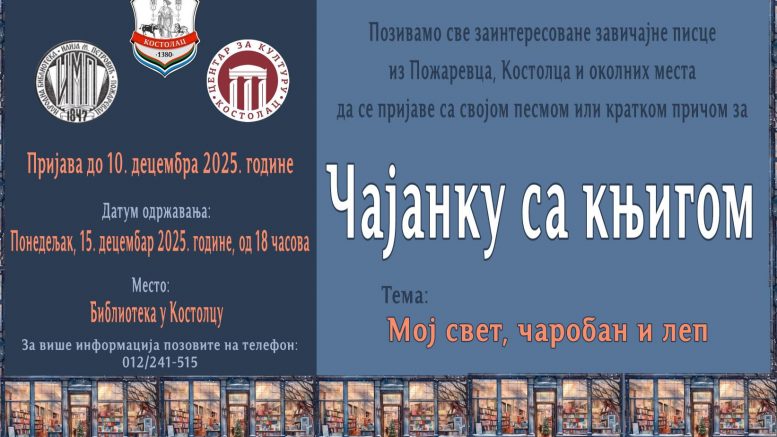 Библиотека у Костолцу позива све заинтересоване завичајне писце из Пожаревца, Костолца и околних места да се пријаве са својом песмом или кратком причом за „Чајанку са књигом“.