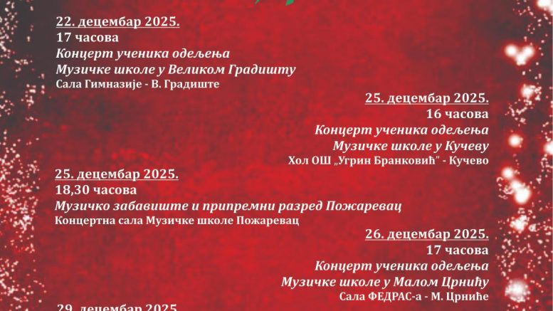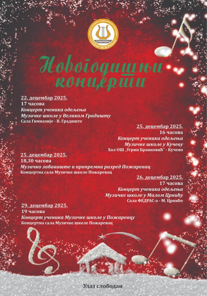У духу предстојећих празника, ученици Музичке школе „Стеван Мокрањац“ из Пожаревца припремили су традиционалне новогодишње концерте, који ће бити одржани током друге половине децембра на више локација у Браничевском округу.