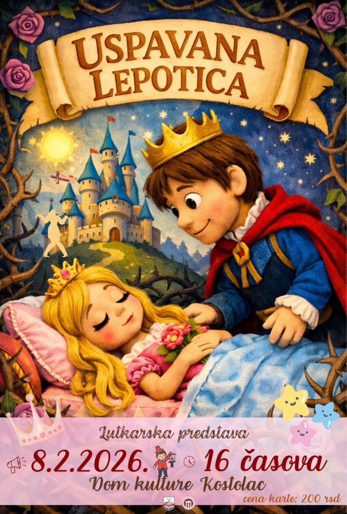 Најмлађу публику, али и све љубитеље бајки, у недељу, 8. фебруара 2026. године, очекује посебан позоришни доживљај. У Дому културе у Костолцу, са почетком у 16.00 часова, биће изведена луткарска позоришна представа „Успавана лепотица“.