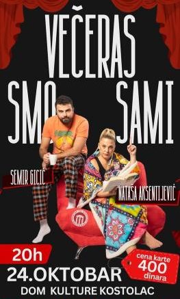 Позоришна представа „Вечерас смо сами“ биће одиграна у петак, 24. октобра 2025. године у Дому културе у Костолцу са почетком у 20.00 часова. Цена улазнице је 400,00 динара. „Вечерас смо сами“ је духовита и динамична…