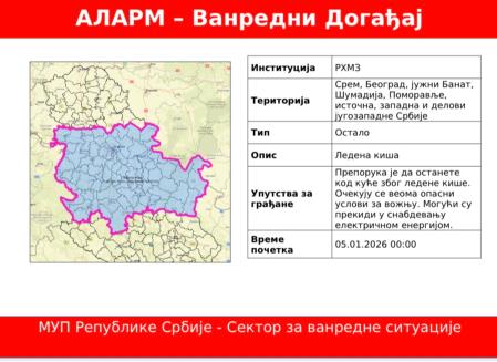 МУП – Сектор за ванредне ситуације издао је озбиљно упозорење на ледену кишу за период од 05. до 07. јануара 2026. године. Очекују се значајни проблеми у саобраћају, укључујући могућност потпуне блокаде саобраћаја, као и…