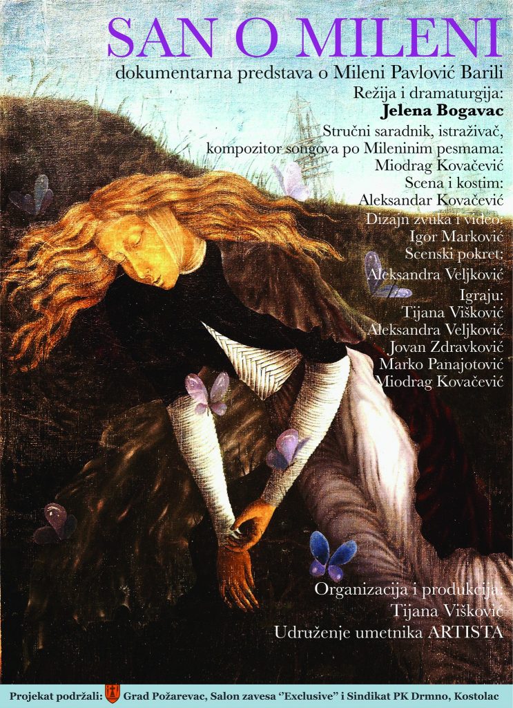 Представа је едукативни, високо поетизовани запис о животу и делу једне од најзанимљивијих локалних уметница која је стекла светску славу. Покретач, продуцент и организатор је Тијана Вишковић, професионална глумица и председница Удружења уметника АРТИСТА ( у чијој продукцији је настала ова представа). Режију и драматургију потписује Јелена Богавац, реномирана драмска уметница. Миодраг Ковачевић је стручни сарадник, истраживач, композитор и извођач песама на поезију Милене Барили. У представи играју Тијана Вишковић, Јован Здравковић, Марко Панајотовић, Александра Вељковић и Миодраг Ковачевић. Костиме и сценографију је осмислио Александар Ковачевић, а дизајн звука и видео-рад Игор Марковић. Своју успешну премијеру , представа је имала у Пожаревцу 17.12.2018. у Центру за културу у Позаревцу, а београдску премијеру 6.02.2019. у Битеф театру у Београду, након чега је имала И још 60 успешних извођења у градовима ,позориштима, фестивалима, медјународним фестивалима, на којима је освајала награде, широм Србије и ван граница земље.Позоришну представу „Сан о Милени“ организује Центар за културу „Костолац“ под покровитељством Градске општине Костолац у склопу манифестације „Новембарски дани културе“.