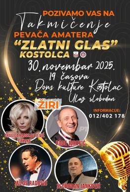 Центар за културу Костолац позива вас на такмичење певача аматера „Златни глас Костолца“ које ће бити одржано 30. новембра 2025. у 19.00 часова у Дому културе у Костолцу.