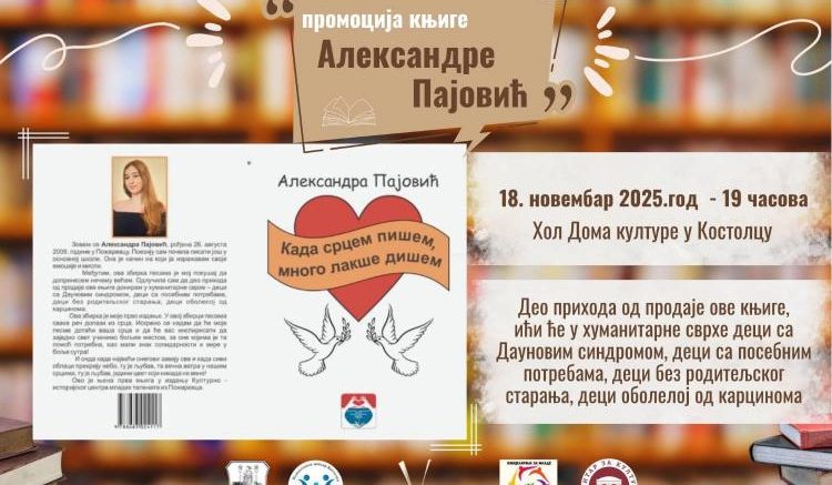 Са великим задовољством вас позивамо на промоцију књиге „Кад срцем пишем – много лакше дишем“ младе и талентоване песникиње Александре Пајовић, чланице „Психолошког центра“ Костолац.Александра је својим стиховима преточила емоције, снове и борбу за доброту…